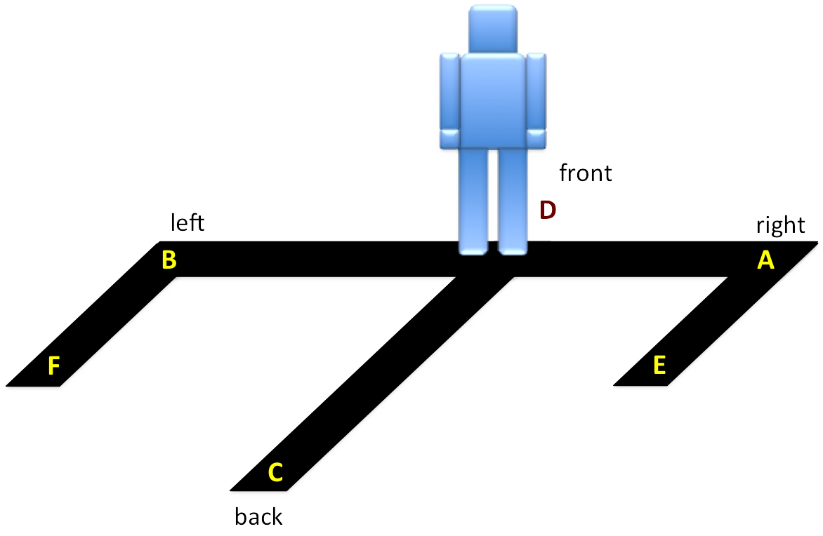 - 8. Lower the left foot to F in a stomping motion to form a Sitting Stance facing B. Left High Outward Knifehand Strike to F.