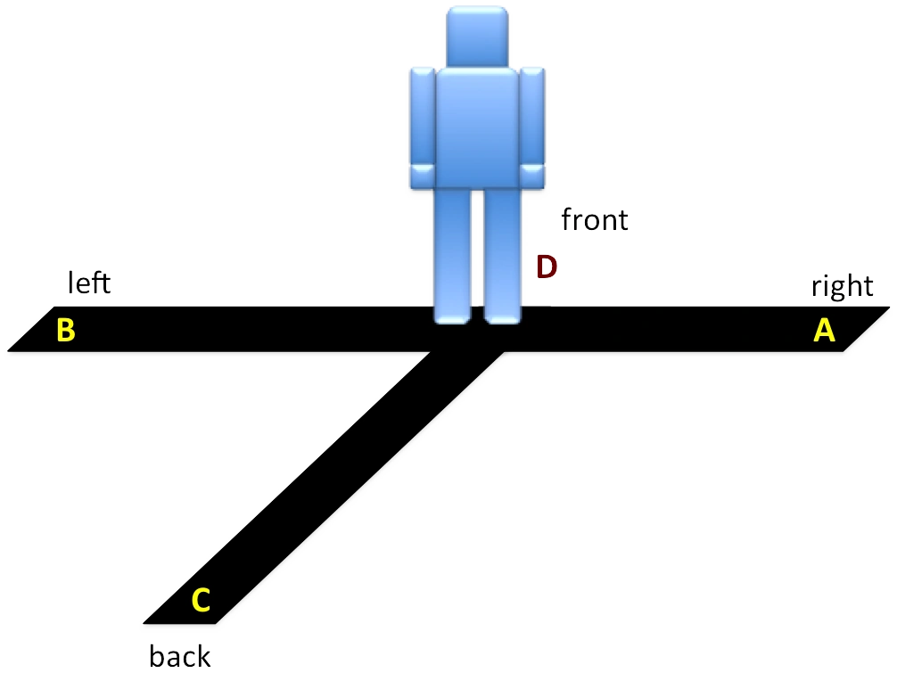 - Step 14. Lower the left foot to C, forming a Left L-Stance (i.e., right foot forward) facing D. Right Knifehand Middle Block to D.