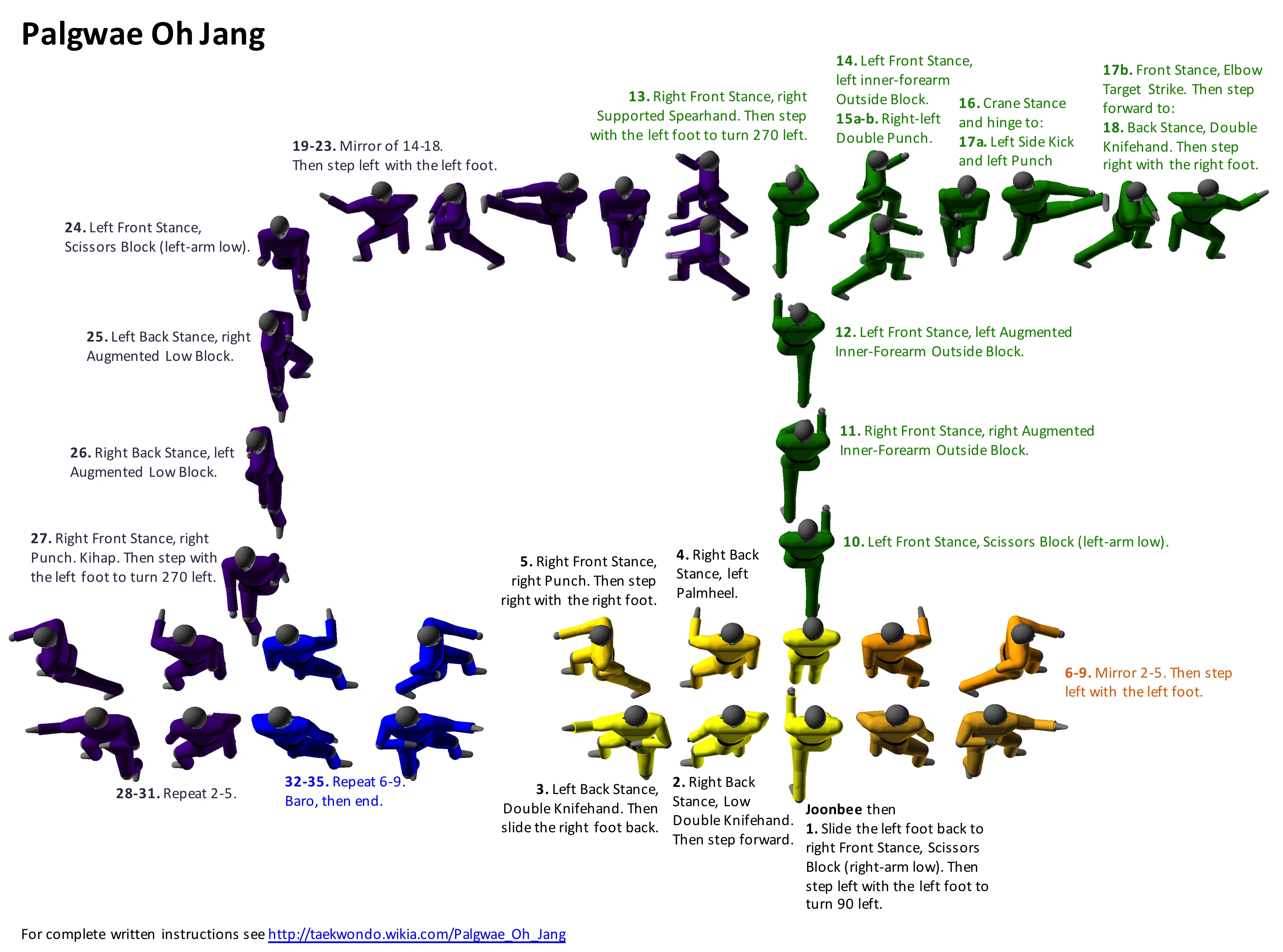 - 19. Step right with the right foot to turn 180 clockwise into Right Front Stance (oreun apkubi) and execute a Right Outward Block (momtong bakkat makgi).