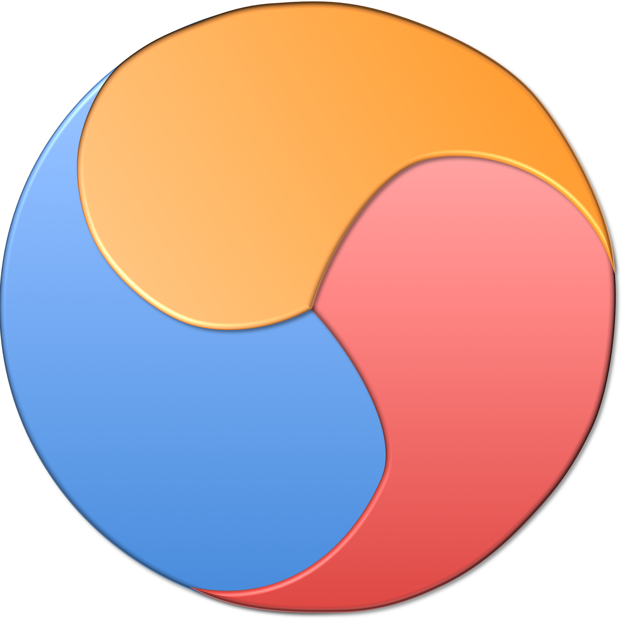 There is a related symbol called the Sam Taegeuk; instead of being divided into two pieces, it's divided into three (recall that sam means three in the sino-Korean numbering system). This symbol has a completely different meaning than the two-piece Taegeuk. The Sam Taegeuk represents the Heavens, the Earth, and Man -- the three sources of all change in the universe.